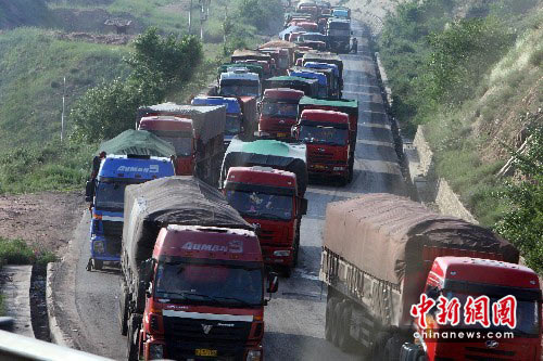 6月23日下午,京藏高速公路張家口附近進(jìn)入河北前往北京、東北地區(qū)路段依舊如同停車場,與高速公路并行的110國道更是步履艱難。中新社發(fā) 任晨鳴 攝