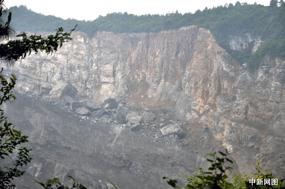 發(fā)生垮塌事故的重慶市武隆縣鐵礦鄉(xiāng)雞尾山山體如被斧劈,活生生砍斷半截,裸露出觸目驚心的黃褐色疤痕。 曹多然 攝