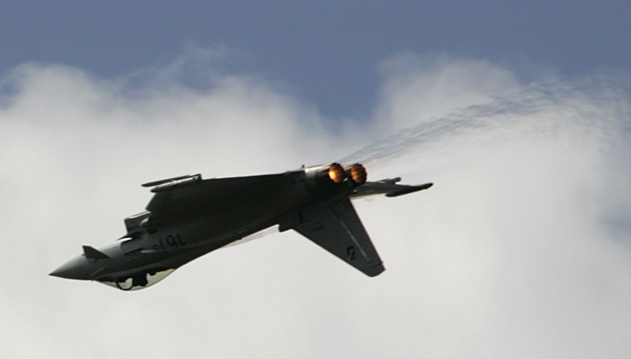 圖為歐洲臺風(fēng)戰(zhàn)斗機進行飛行表演。