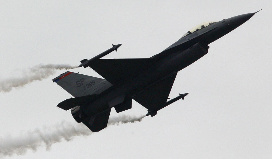 圖為美國F-16戰(zhàn)斗機(jī)進(jìn)行飛行表演。