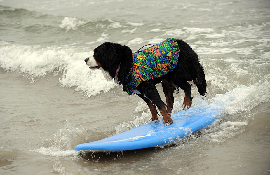 6月20日,在美國(guó)加利福尼亞州帝國(guó)沙灘舉行了一場(chǎng)小狗沖浪比賽,小狗們表現(xiàn)得十分認(rèn)真。