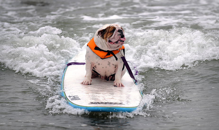 6月20日,在美國加利福尼亞州帝國沙灘舉行了一場小狗沖浪比賽,小狗們表現(xiàn)得十分認真。