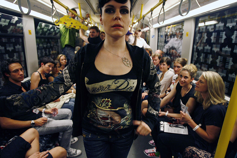 7月2日,模特在德國首都柏林的一輛地鐵上,演繹名為“地鐵上的貓步”時裝秀。