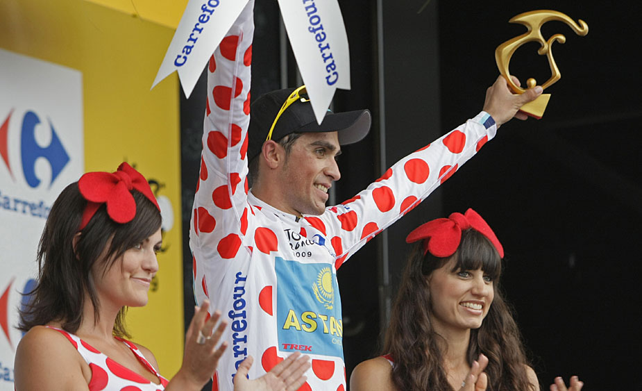 圖為“爬坡王”康塔德身著斑點(diǎn)衫慶祝瞬間。