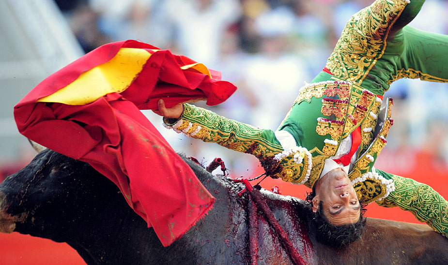 7月5日,西班牙巴塞羅那舉行了一場驚險(xiǎn)的斗牛比賽,一位斗牛士在與牛較量時(shí)被牛頂起,所幸該人“武功”高強(qiáng)未造成大的傷害。