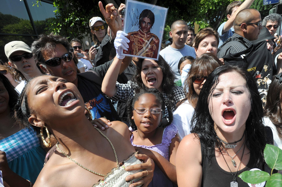 數(shù)百名沒有入場(chǎng)券的歌迷聚集在附近的警戒線外高呼邁克爾的名字,共同悼念一代“流行天王”。 中新社發(fā) 張煒 攝