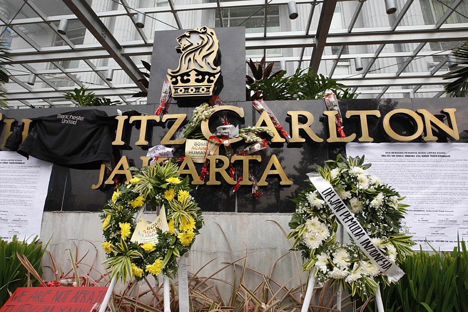 7月18日,印度尼西亞首都雅加達(dá)的民眾紛紛來到發(fā)生爆炸的萬豪酒店和麗嘉酒店,向死難者獻(xiàn)花表示哀悼。