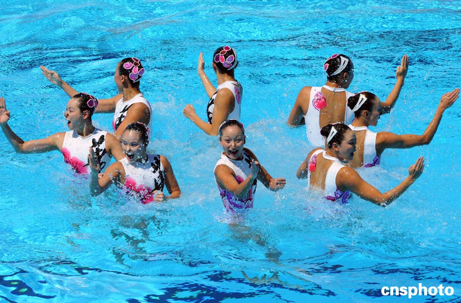 7月19日,中國隊的姑娘們以中國功夫亮相羅馬游泳世錦賽花樣游泳集體技術(shù)自選動作決賽泳池。當(dāng)日,第13屆游泳世錦賽花樣游泳項目在意大利羅馬舉行,集體技術(shù)自選動作的決賽中,俄羅斯隊毫無懸念地奪得冠軍,西班牙隊獲得亞軍,中國隊獲得了這個項目的季軍,創(chuàng)造了自己在世錦賽上的最好成績。中新社發(fā) 廖攀 攝