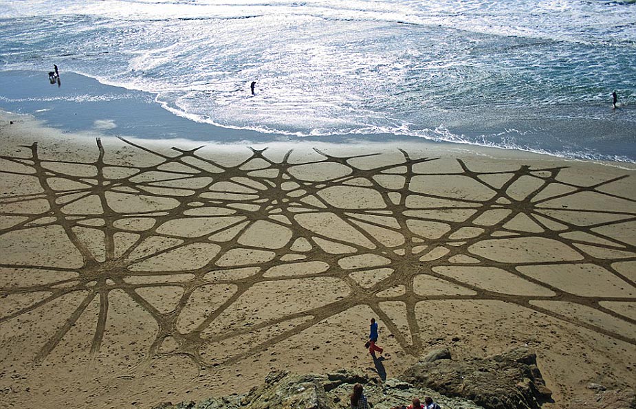 據(jù)英國(guó)媒體7月27日?qǐng)?bào)道,藝術(shù)家Andres Amador用耙子在沙灘上作畫(huà),眾多中心對(duì)稱(chēng)的幾何圖形,不在乎是否能長(zhǎng)久保留,但求被海浪帶走前與大自然的完美融合。
