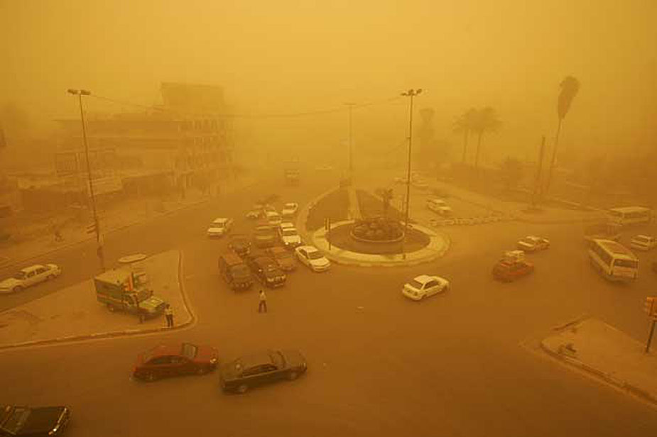 7月29日,伊拉克首都巴格達遭受沙塵暴襲擊。當(dāng)?shù)鼐用窦娂娪酶鞣N物品保護住口鼻,以免吸入沙塵。