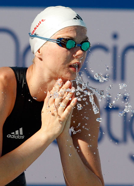 “口吐蓮花”——7月30日,德國選手布麗塔·斯特芬完成女子100米自由泳預(yù)賽后表演“口吐蓮花”。