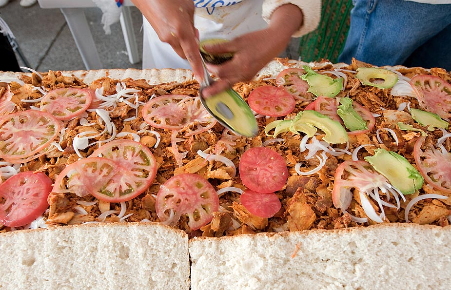 7月31日,在墨西哥首都墨西哥城舉辦的“墨西哥三明治節(jié)”上,200多人用肉、火腿、西紅柿、奶酪等各種餡料合作制成了長達(dá)46米的墨西哥三明治,試圖創(chuàng)造世界最長的墨西哥三明治紀(jì)錄。