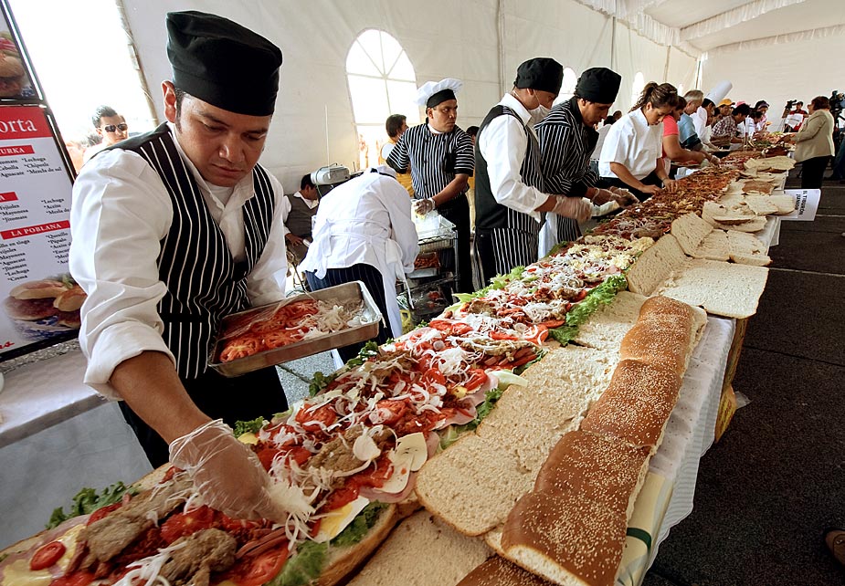 7月31日,在墨西哥首都墨西哥城舉辦的“墨西哥三明治節(jié)”上,200多人用肉、火腿、西紅柿、奶酪等各種餡料合作制成了長達(dá)46米的墨西哥三明治,試圖創(chuàng)造世界最長的墨西哥三明治紀(jì)錄。