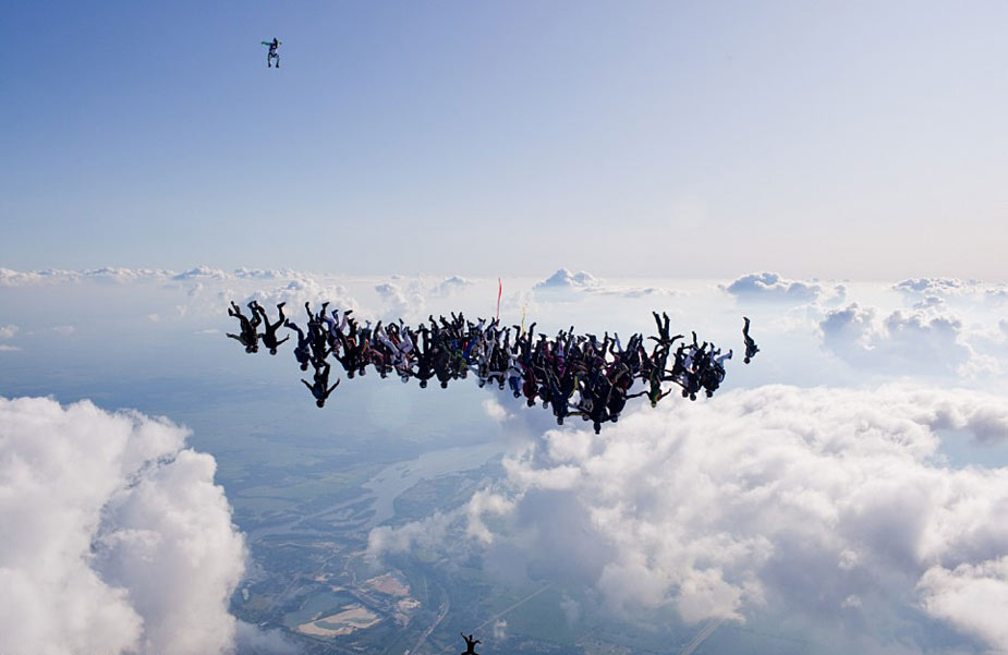 據(jù)英國(guó)媒體8月2日?qǐng)?bào)道,美國(guó)上空108名傘降者從1.8萬(wàn)英尺(約5.48公里)高空以180英里每小時(shí)時(shí)速跳下,并在空中組成各種圖形,欲打破世界紀(jì)錄。