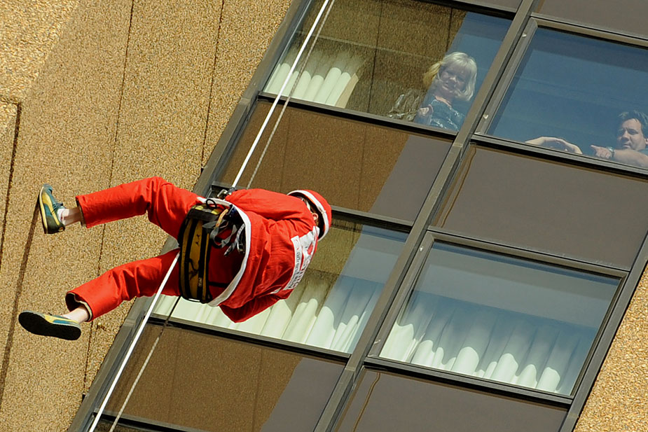 8月5日,澳大利亞5名男子身著圣誕老人服飾從悉尼歌劇院旁一高層酒店樓頂“從天而降”。