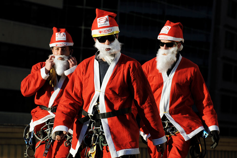 8月5日,澳大利亞5名男子身著圣誕老人服飾從悉尼歌劇院旁一高層酒店樓頂“從天而降”。