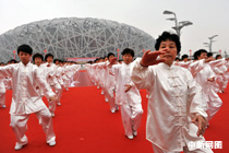 8月8日,全國首個“全民健身日”北京主會場啟動儀式上,三萬多群眾進行太極拳展示活動,在世界吉尼斯總部認證官員的見證下成功打破世界紀錄。 中新網(wǎng)記者 金碩 攝