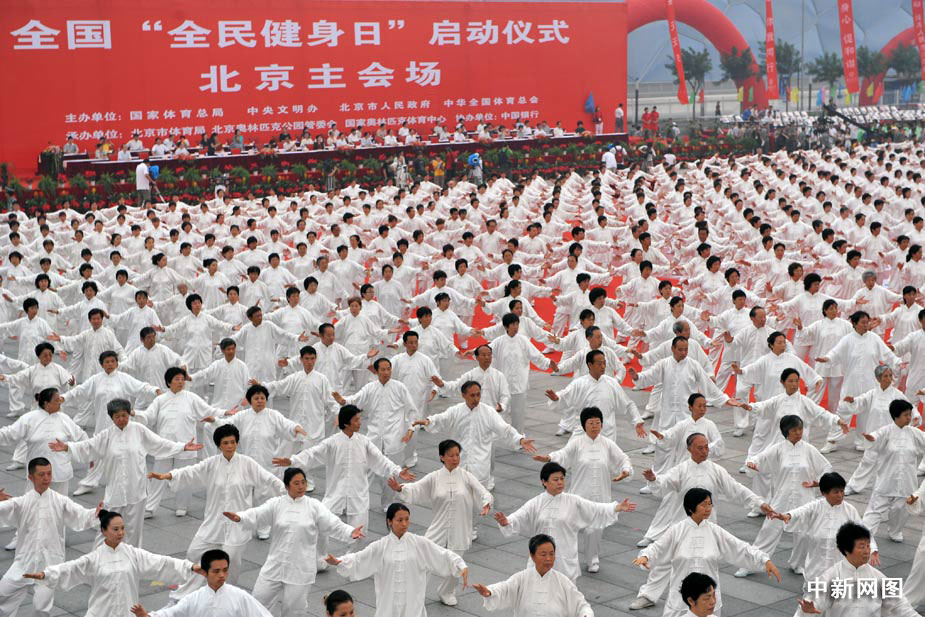8月8日,全國首個(gè)“全民健身日”北京主會(huì)場啟動(dòng)儀式上,三萬多群眾進(jìn)行太極拳展示活動(dòng),在世界吉尼斯總部認(rèn)證官員的見證下成功打破世界紀(jì)錄。中新網(wǎng)記者 金碩 攝