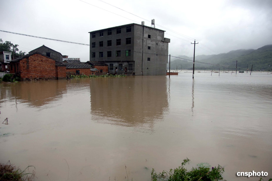 8月9日,第8號臺風(fēng)“莫拉克”于16時20分在福建省霞浦縣沿海登陸,登陸時臺風(fēng)中心最大風(fēng)速12級(33米/秒),中心氣壓970百帕。由于受到“莫拉克”帶來的強降雨影響,霞浦洪山村內(nèi)澇嚴(yán)重。中新社發(fā) 王東明 攝