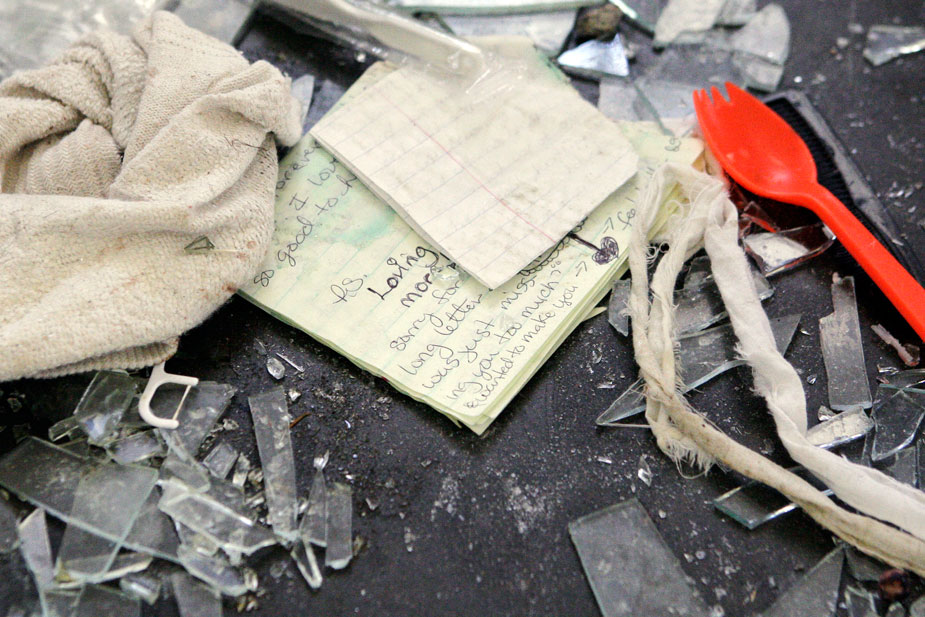 圖為一名囚犯的信和地板上到處都是的碎玻璃。8月8日晚至9日凌晨,美國加州南部奇諾市發(fā)生大規(guī)模監(jiān)獄騷亂,截至目前,在250多名受傷的在押犯人中,仍有16名犯人在醫(yī)院接受治療。