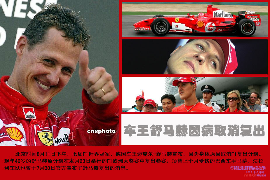 中新網(wǎng)本周熱點人物之舒馬赫——車王復(fù)出,本應(yīng)是F1年度的最大新聞,最終卻以鬧劇的方式結(jié)尾。短短的13天時間,舒馬赫帶領(lǐng)全世界的車迷們上了天堂,又目送著他們的心情跌落到了地獄。