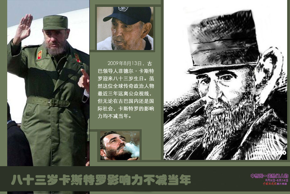 中新網(wǎng)本周熱點人物之菲德爾·卡斯特羅——卡斯特羅一九二六年生于古巴奧爾金省比蘭鎮(zhèn),一九四九年加入古巴共產(chǎn)黨。一九五九年率領(lǐng)起義軍推翻巴蒂斯塔獨裁政權(quán),成立革命政府,出任政府總理和武裝部隊總司令,自此成為古巴政壇“一號人物”,直至二00六年因身體原因不再坐鎮(zhèn)一線。