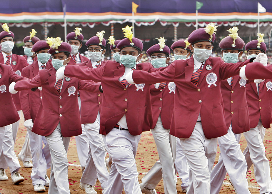 慶祝獨(dú)立62周年閱兵式上的印度童軍在做隊列表演。