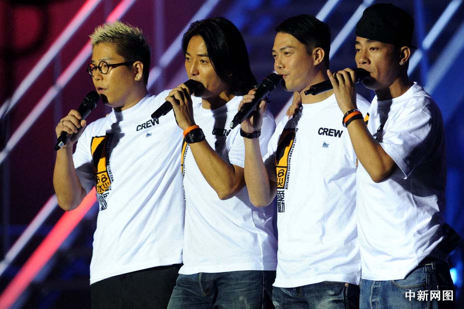 圖為林曉峰、鄭伊健、謝天華、陳小春在現(xiàn)場演出。