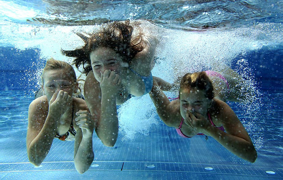 德國東部城市拉德博伊爾,三個(gè)女孩在泳池里嬉戲。