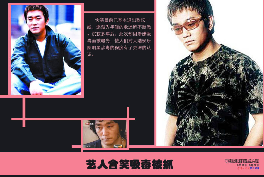 中新網(wǎng)本周熱點(diǎn)人物之——含笑 北京警方十四日證實(shí),市公安局禁毒處根據(jù)線索,在京城的兩個(gè)城區(qū)相繼查獲十名涉嫌吸毒人員并起獲部分毒品,這十名吸毒者中包括了中國(guó)著名歌手含笑。