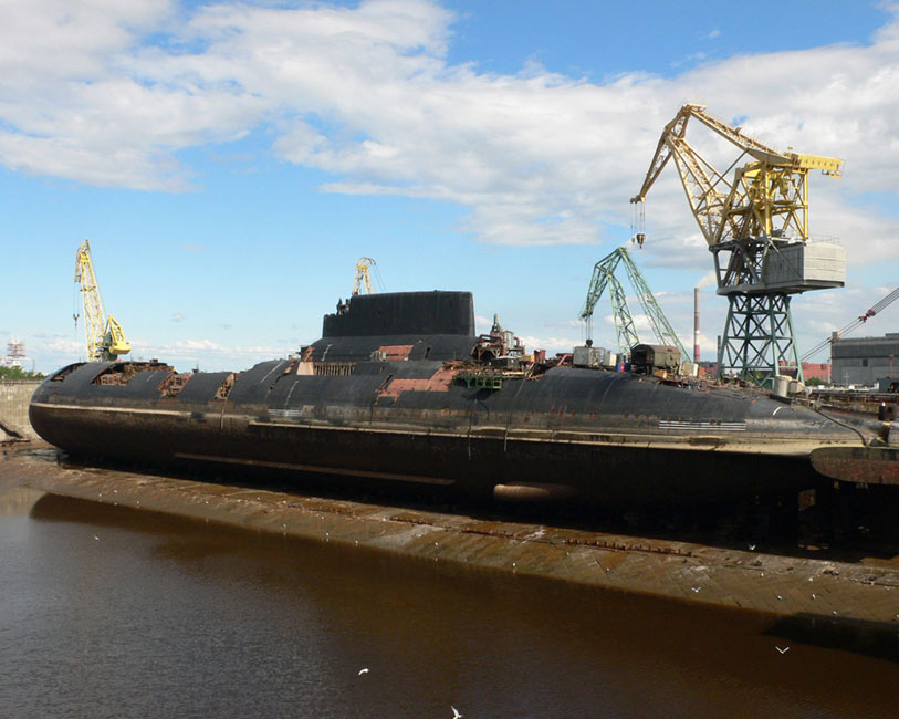 被拆解的核潛艇屬于臺(tái)風(fēng)級(jí)戰(zhàn)略核潛艇,編號(hào)TK13。2008年7月,該艇被運(yùn)抵俄羅斯北部北德文斯克的茲韋茲多奇卡(Zvezdochka)船廠。在那里退役并進(jìn)行拆解。目前正進(jìn)行艦體拆解工程,從圖片上看進(jìn)度已經(jīng)完成三分一左右。