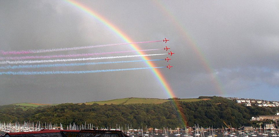 據(jù)英國(guó)媒體近日?qǐng)?bào)道,英國(guó)皇家空軍“紅箭”飛行表演隊(duì)20日在英國(guó)康沃爾郡福伊港進(jìn)行飛行特技表演時(shí),恰巧天邊出現(xiàn)一道彩虹,相映成輝,異常漂亮。