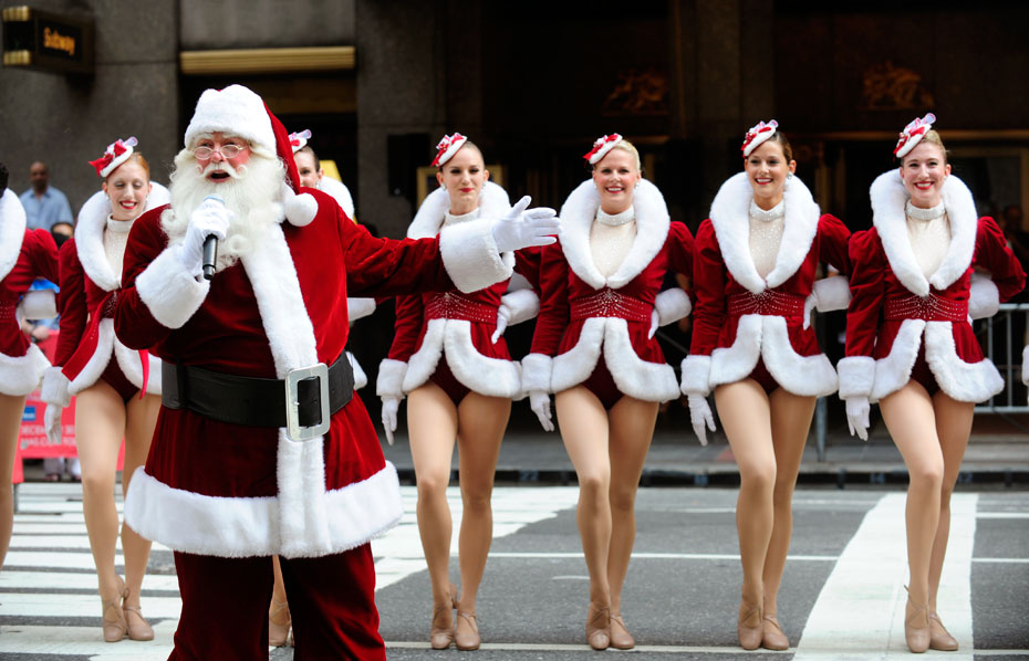 8月25日,美國(guó)“火箭女郎”舞蹈團(tuán)身著圣誕裝在無(wú)線電城音樂(lè)廳(Radio City Music Hall)前演出。來(lái)源:中國(guó)新聞網(wǎng)