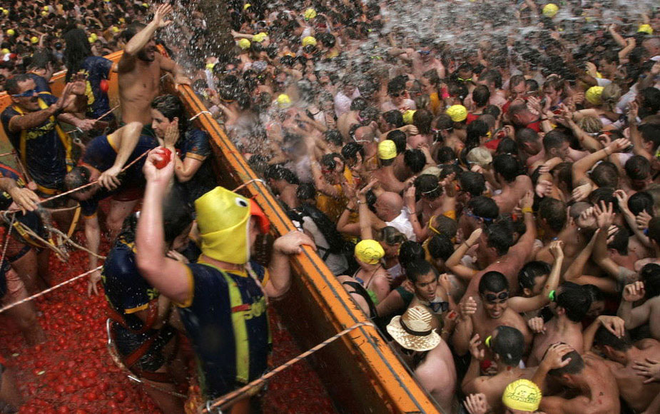 8月26日,西班牙東南部小鎮(zhèn)Bunol當日迎來傳統(tǒng)的西紅柿節(jié)。大約4萬名狂歡者在1小時內扔掉了11萬公斤西紅柿。來源:中國新聞網