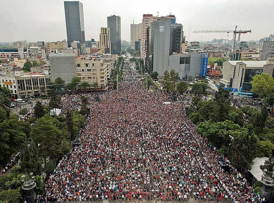 8月29日,逾萬名墨西哥人在墨西哥城廣場同時(shí)跳舞,用以紀(jì)念邁克爾·杰克遜第51個“生日”,同時(shí)也試圖打破同時(shí)跳舞人數(shù)最的吉尼斯世界紀(jì)錄。圖片來源:中國新聞網(wǎng)