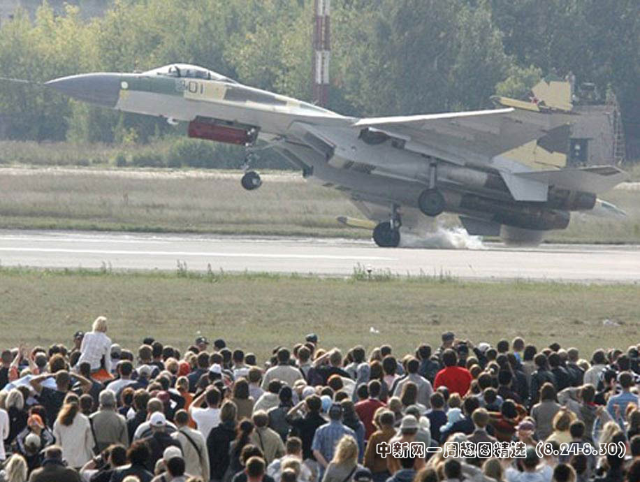 8月24日,莫斯科航展閉幕日上進(jìn)行飛行表演的蘇-35戰(zhàn)機(jī),在技能高超的飛行員駕駛下,玩起了單輪著陸特技動(dòng)作,令現(xiàn)場(chǎng)的觀(guān)眾大飽眼神。圖片來(lái)源:中國(guó)新聞網(wǎng)