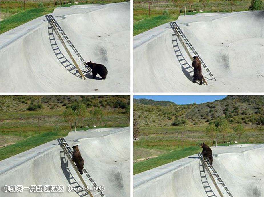 8月25日,美國(guó)科羅拉多州一只被困滑板池的狗熊成功爬梯逃生,在監(jiān)控器前上演了一出“狗熊版越獄”。圖片來(lái)源:中國(guó)新聞網(wǎng)