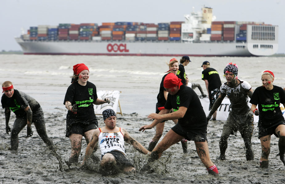 當?shù)貢r間8月30日,德國北部海邊小鎮(zhèn)Brunsbuettel的泥灘上進行一場別開生面的泥地足球賽。男女“球員”混合在一起,泥地中盡情撒野,享受著不一樣的樂趣。