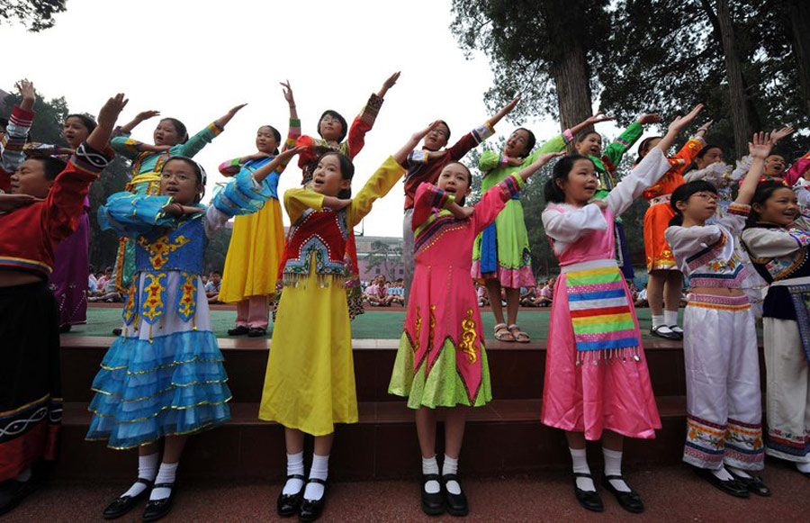 北京中關村三小開學典禮上,56個民族小伙伴齊唱高唱《好大的家》。本學年民族教育主題為“祖國發(fā)展我成長,民族團結一家親”。李木易/CFP