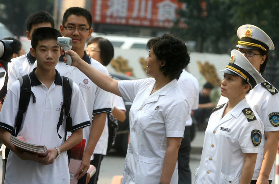 2009年8月31日,北京匯文中學(xué),校門口北京市衛(wèi)生局工作人員開始針對(duì)返校學(xué)生進(jìn)行體溫測(cè)試。