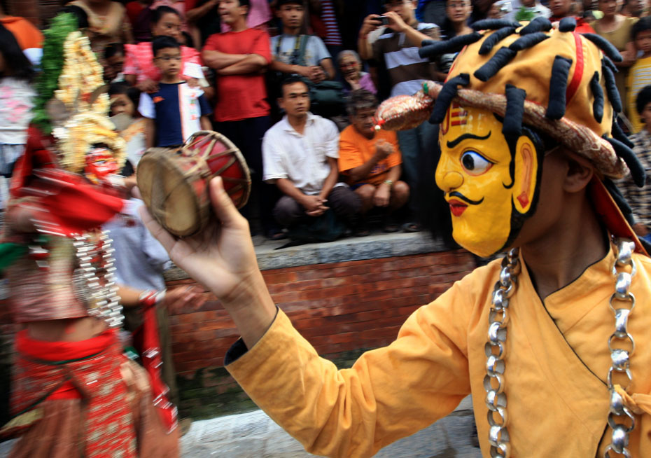 圖為節(jié)日當(dāng)天人們戴上傳統(tǒng)的尼泊爾面具載歌載舞。
