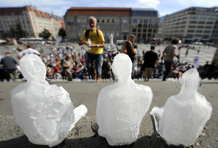9月2日,德國(guó)柏林,世界野生動(dòng)物基金會(huì)(WWF)將1000個(gè)小冰人被放置在了御林廣場(chǎng)音樂廳的臺(tái)階上,小冰人慢慢融化成水;顒(dòng)的組織者希望此舉能引起公眾對(duì)于全球變暖的關(guān)注。來源:中國(guó)新聞網(wǎng)