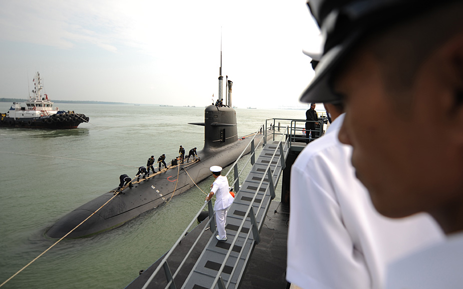 9月3日,由法國制造的馬來西亞首艘“鲉魚”級潛艇“東古·阿卜杜勒·拉赫曼”號駛入馬來西亞首都吉隆坡的克朗港。圖片來源:中國新聞網(wǎng)