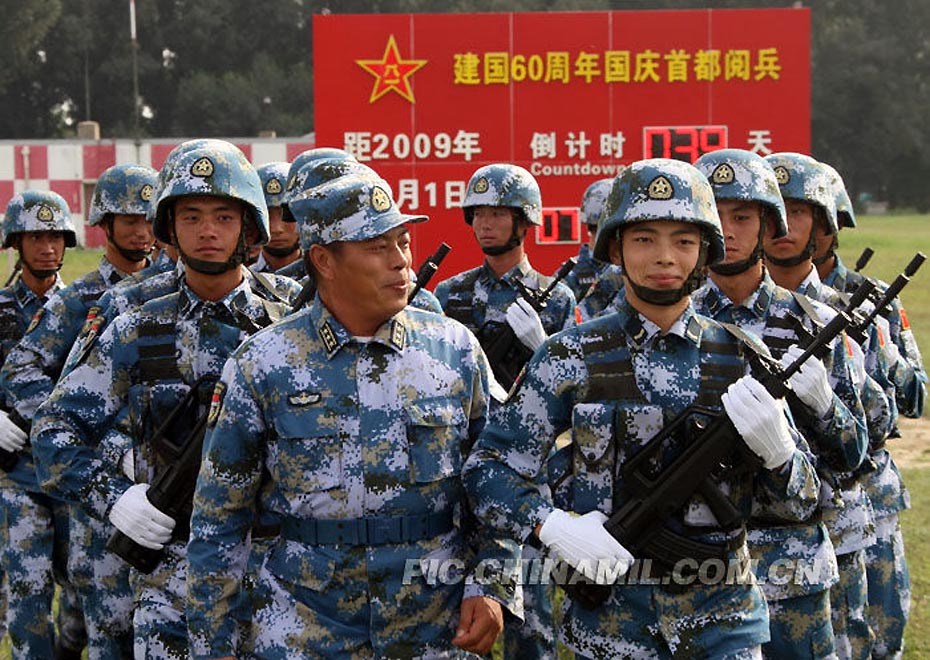 9月3日,解放軍官兵在位于北京郊區(qū)的一處徒步方隊閱兵村內訓練。今年國慶節(jié)將舉行新中國成立60周年國慶首都盛大閱兵儀式。來源:中國軍網(wǎng)