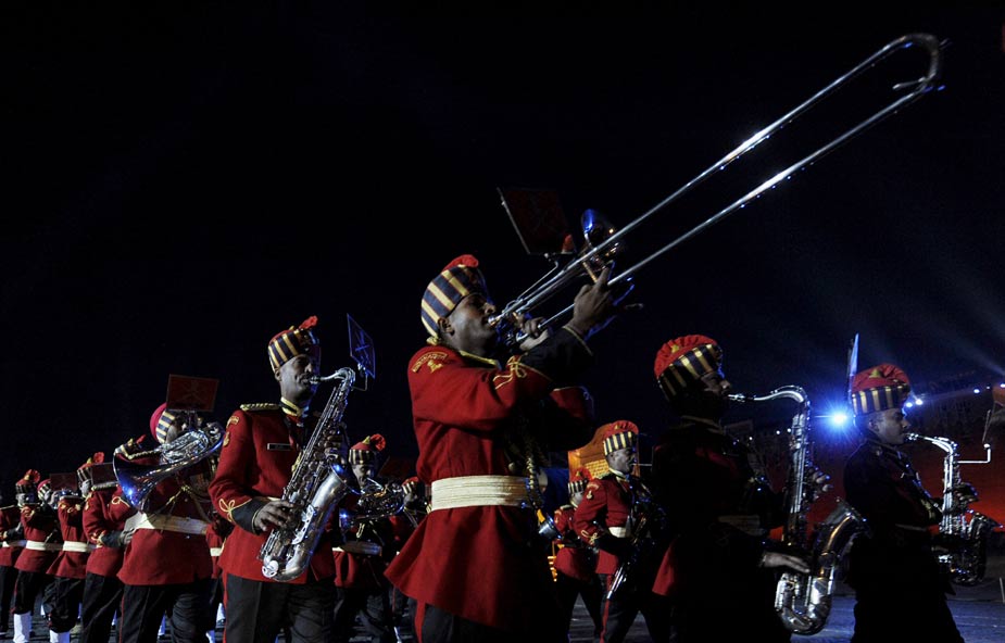 9月4日晚,俄羅斯莫斯科紅場舉行了俄羅斯國際軍樂節(jié)開幕前夕的總彩排。首屆俄羅斯國際軍樂節(jié)將于9月5日至10日在莫斯科紅場舉行。圖為印度軍樂團(tuán)正在進(jìn)行彩排。
