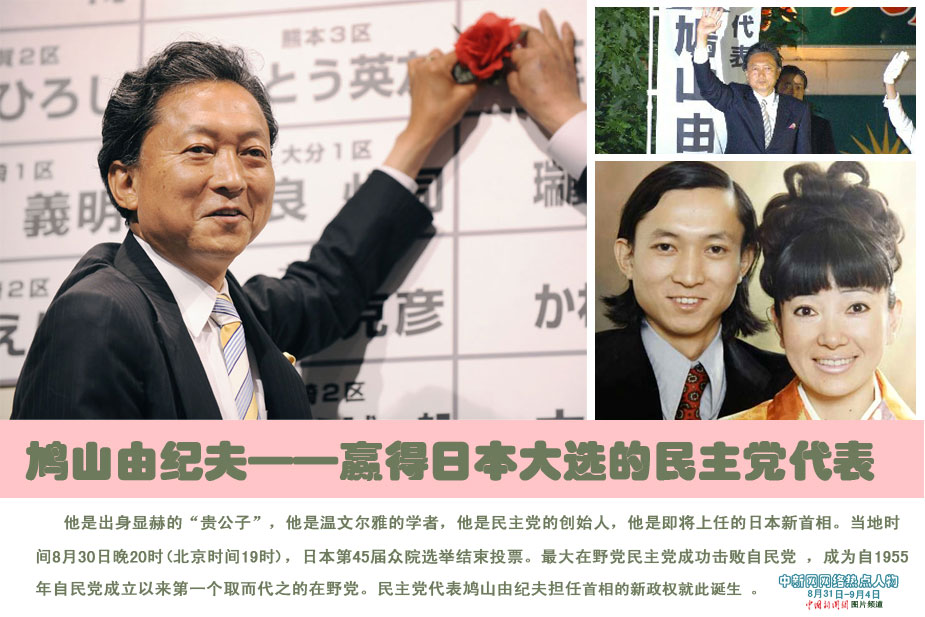 中新網(wǎng)本周熱點人物之——鳩山由紀夫 他是出身顯赫的“貴公子”,他是溫文爾雅的學(xué)者,他是民主黨的創(chuàng)始人,他是即將上任的日本新首相。 當(dāng)?shù)貢r間8月30日晚20時(北京時間19時),日本第45屆眾院選舉結(jié)束投票。最大在野黨民主黨成功擊敗自民黨 ,成為自1955年自民黨成立以來第一個取而代之的在野黨。民主黨代表鳩山由紀夫擔(dān)任首相的新政權(quán)就此誕生 。來源:中國新聞網(wǎng)