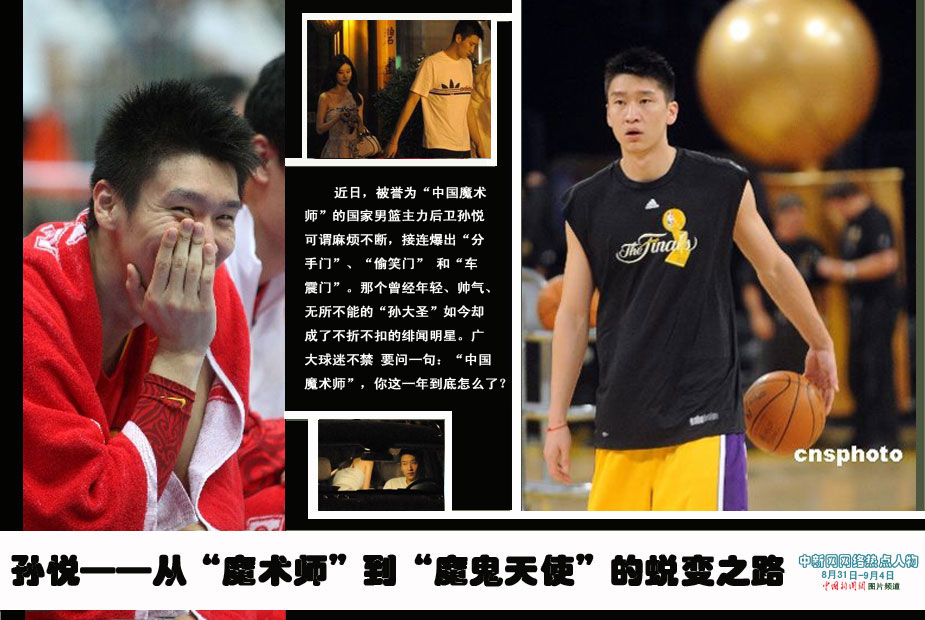 中新網(wǎng)本周熱點(diǎn)人物之——孫悅 近日,被譽(yù)為“中國魔術(shù)師”的國家男籃主力后衛(wèi)孫悅可謂麻煩不斷,接連爆出“分手門”、“偷笑門” 和“車震門”。那個曾經(jīng)年輕、帥氣、無所不能的“孫大圣”如今卻成了不折不扣的緋聞明星。廣大球迷不禁 要問一句:“中國魔術(shù)師”,你這一年到底怎么了?圖片來源:中國新聞網(wǎng)