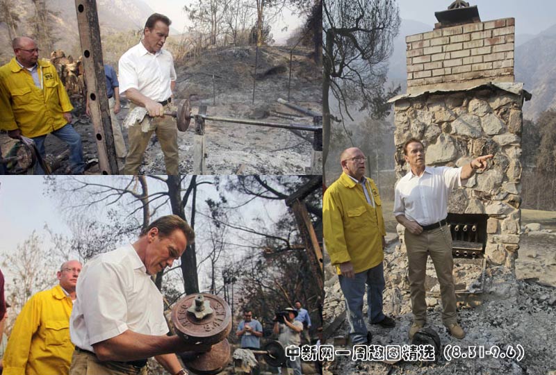 當(dāng)?shù)貢r間9月3日,加州州長施瓦辛格探訪了洛杉磯市圖洪加附近被火災(zāi)燒毀的地區(qū)。圖片來源:中國新聞網(wǎng)