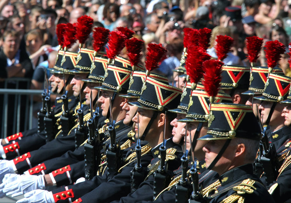 2009年7月14日,法國在巴黎香榭麗舍大道上舉行傳統(tǒng)閱兵儀式,慶祝該國國慶節(jié),圖為法國共和國衛(wèi)隊(duì)接受檢閱。
