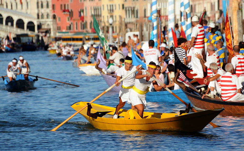賽舟會:是意大利一項具有悠久歷史的節(jié)日,每年的9月第一個星期日在威尼斯大運河上舉辦蔚為壯觀的彩船游行,隨后是剛多拉小船和其他船只的賽舟會,威尼斯的劃船好手都會聚集到大運河上參加傳統(tǒng)賽舟會,許多人換上富有古典韻味的服裝,或在岸邊觀賽,或泛舟水上,整個城市似乎重回文藝復興時期。